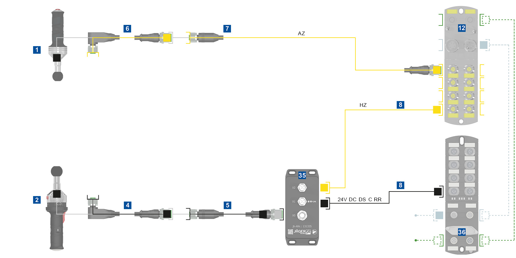 Hinweis: Bei bewegten Leitungen empfehlen wir die Verbindungsleitungen vor und nach jedem Richtungswechsel zu stecken. Bei IO-Link Bedienhandgriffen sollte die Gesamtleitungslänge von 20m nicht überschritten werden.
