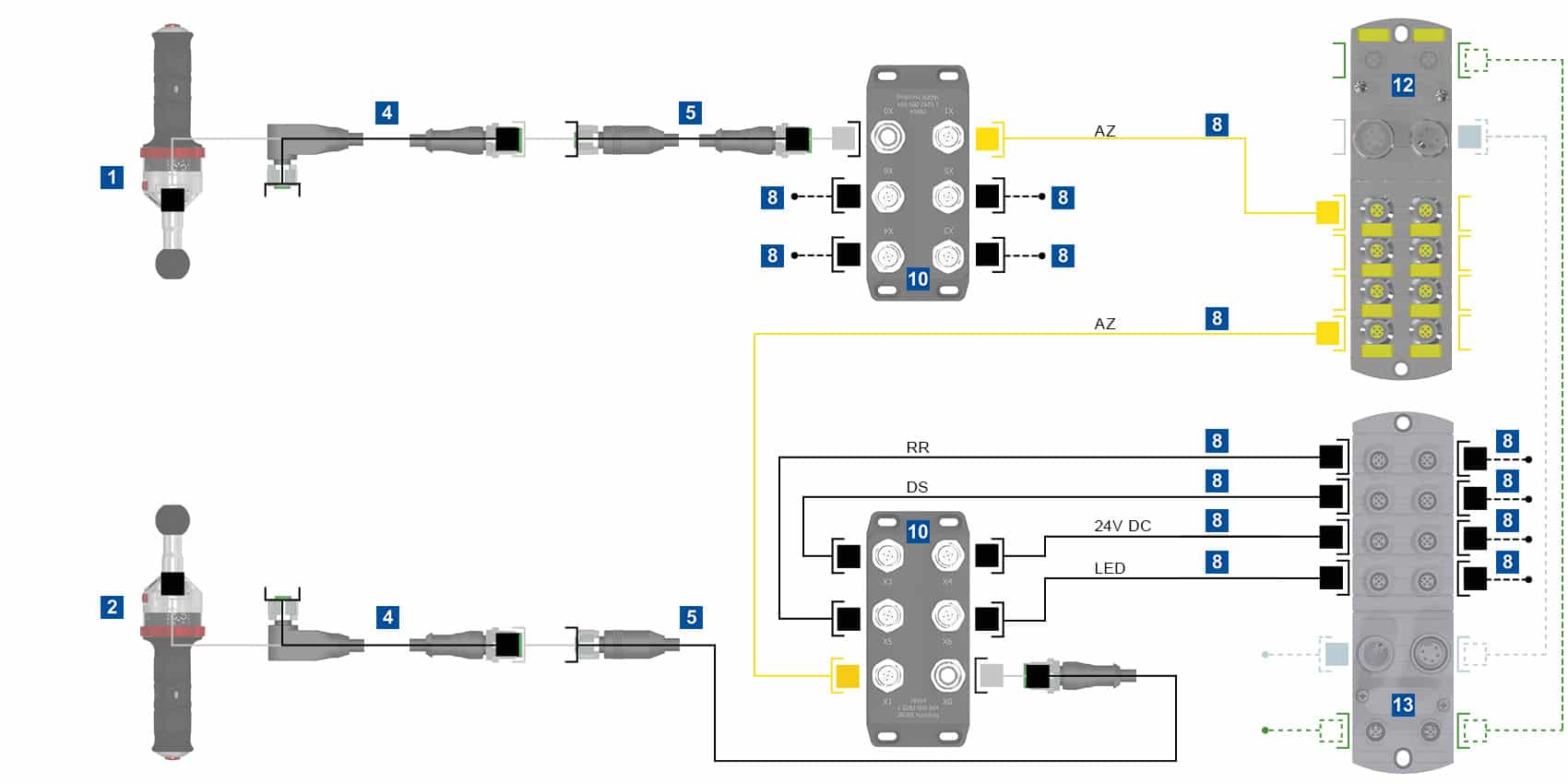Hinweis: Bei bewegten Leitungen empfehlen wir die Verbindungsleitungen vor und nach jedem Richtungswechsel zu stecken. Die Gesamtleitungslänge von 70m sollte nicht überschritten werden.