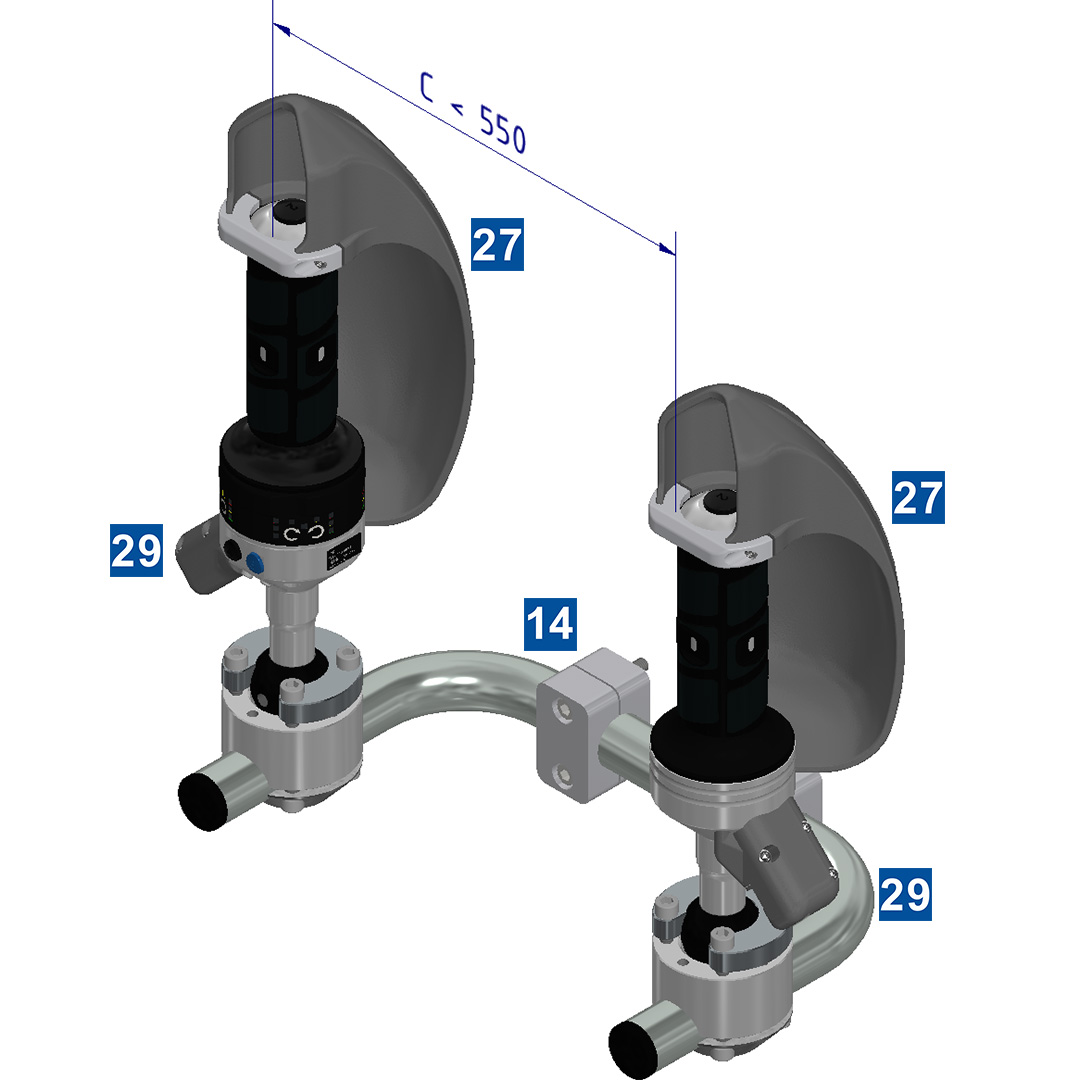 Bitte beachten Sie, dass bei einer sicheren Zweihandbetätigung ein Mindestabstand von C = 550mm zwischen den Tastern einzuhalten ist. Sollte dieses Maß unterschritten werden, ist je Handgriff ein Protektor erforderlich, um das gleichzeitige Betätigen beider Taster mit Hand und Ellenbogen desselben Arms zu verhindern. Wie wird das Maß C berechnet?