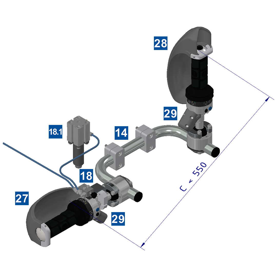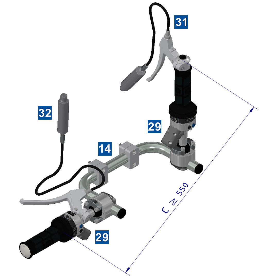 Bitte beachten Sie, dass bei einer sicheren Zweihandbetätigung ein Mindestabstand von C = 550mm zwischen den Tastern einzuhalten ist. Sollte dieses Maß unterschritten werden, ist je Handgriff ein Protektor erforderlich, um das gleichzeitige Betätigen beider Taster mit Hand und Ellenbogen desselben Arms zu verhindern. Wie wird das Maß C berechnet?