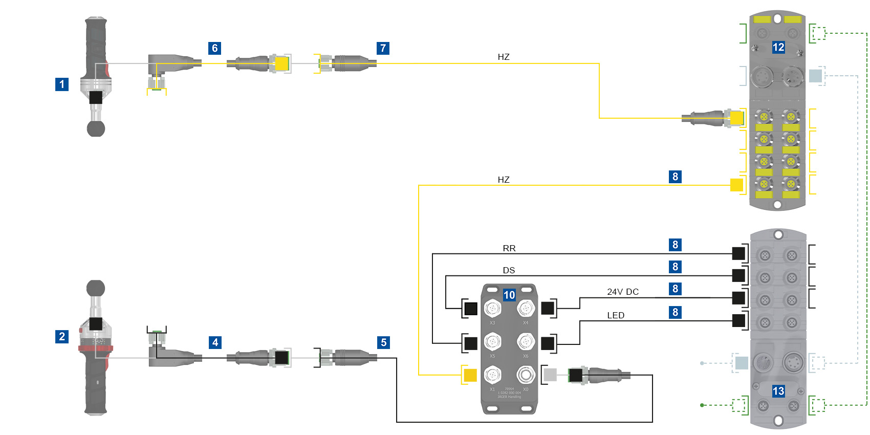 Hinweis: Bei bewegten Leitungen empfehlen wir die Verbindungsleitungen vor und nach jedem Richtungswechsel zu stecken. Die Gesamtleitungslänge von 70m sollte nicht überschritten werden.