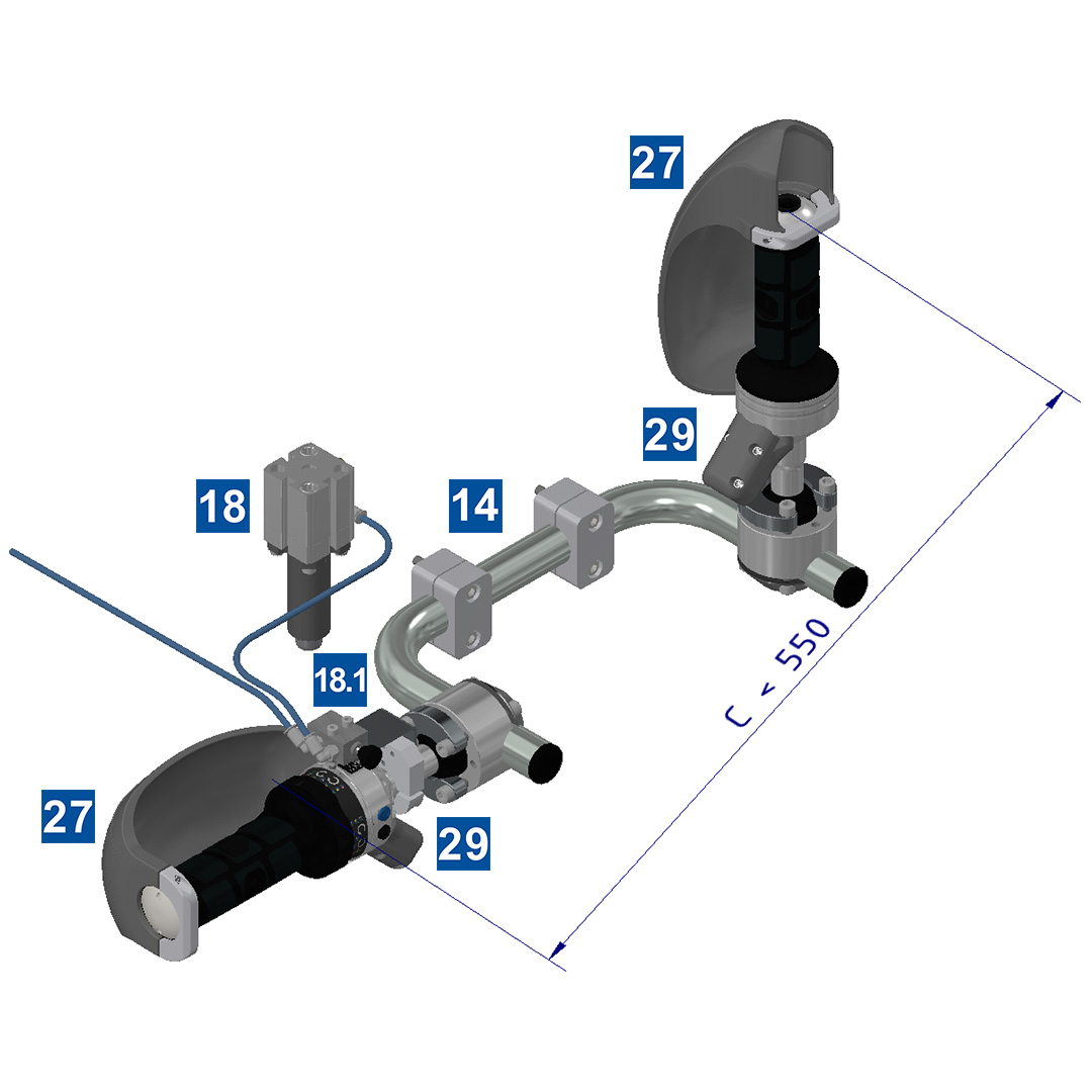 Bitte beachten Sie, dass bei einer sicheren Zweihandbetätigung ein Mindestabstand von C = 550mm zwischen den Tastern einzuhalten ist. Sollte dieses Maß unterschritten werden, ist je Handgriff ein Protektor erforderlich, um das gleichzeitige Betätigen beider Taster mit Hand und Ellenbogen desselben Arms zu verhindern. Wie wird das Maß C berechnet?