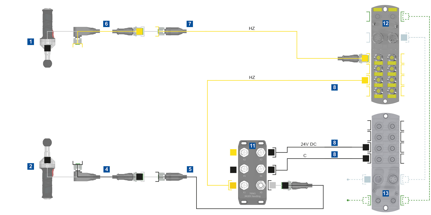 Hinweis: Bei bewegten Leitungen empfehlen wir die Verbindungsleitungen vor und nach jedem Richtungswechsel zu stecken. Die Gesamtleitungslänge von 70m sollte nicht überschritten werden.