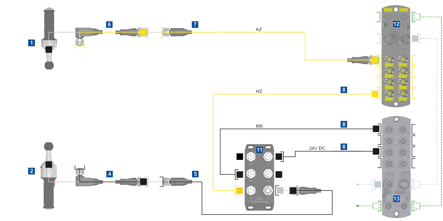 Hinweis: Bei bewegten Leitungen empfehlen wir die Verbindungsleitungen vor und nach jedem Richtungswechsel zu stecken. Die Gesamtleitungslänge von 70m sollte nicht überschritten werden.
