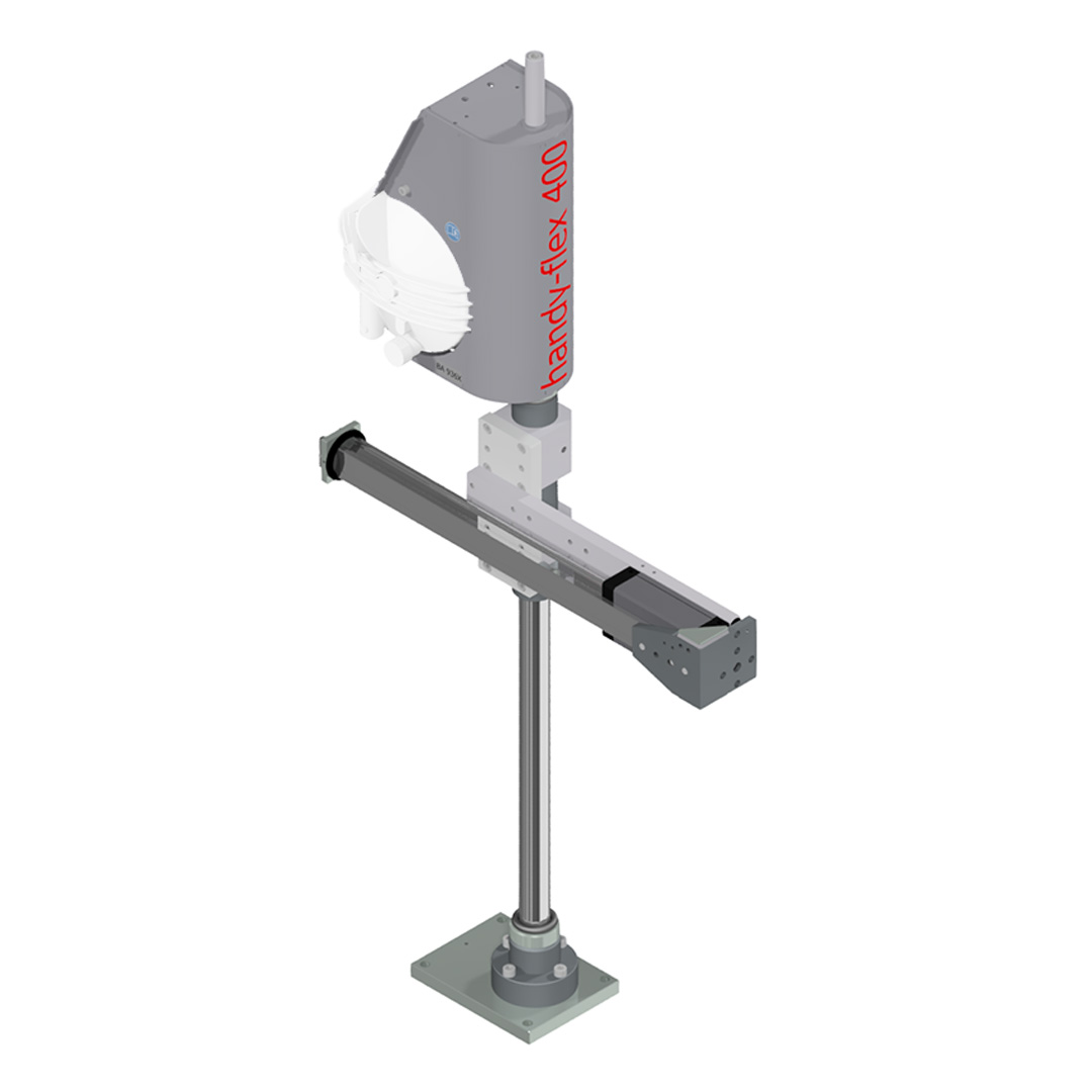 Das handy-flex 400c (Kompaktausführung) ist ein aufgeständertes Werkzeugführungsstativ zur Aufnahme von hohen statischen Lasten und Drehmomenten bei Anwendungen mit begrenztem Platz. Es ermöglicht die Führung und Positionierung von Arbeitsmaschinen sowie die Aufnahme von Reaktionsmomenten in horizontaler und vertikaler Richtung.