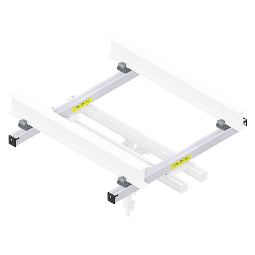 Mit der Kranbahn Zweispur werden Lasten mittels eines Fahrwerks bewegt. Sie besteht aus einer 2000 - 5000mm langen Laufschiene Gr. S / M, Fabrikat eepos die mit zwei / drei Staraufhängungen an Stahlträgern befestigt wird. Zur Begrenzung des Hubs sind zwei verstellbare Anschläge vorhanden zusätzlich sind am jeweiligen Ende der Schiene zwei Festanschläge verbaut. Die Stirnseiten der Laufschiene werden durch einen Profilabschluss abgedeckt.