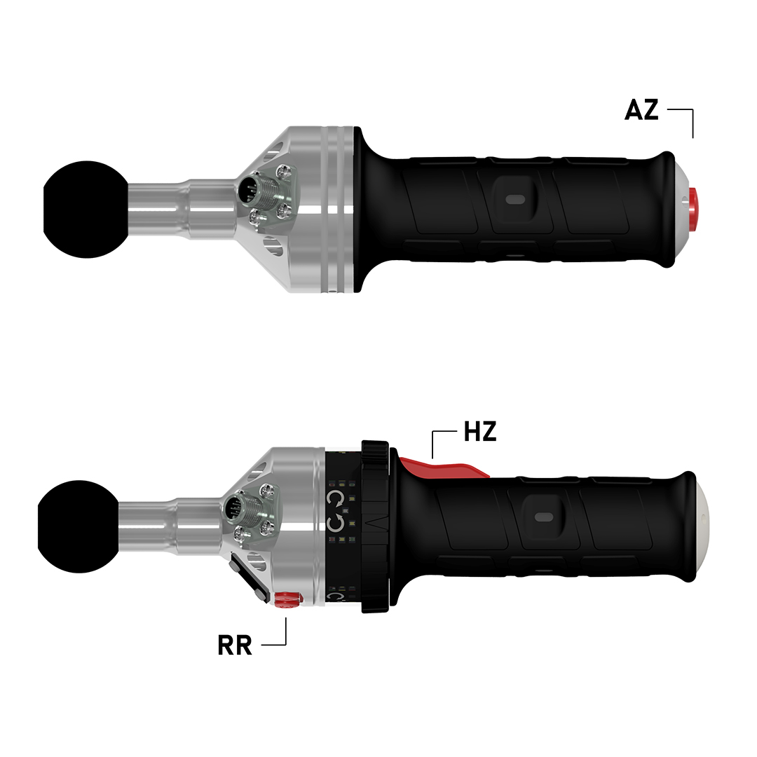 THAZ: Dieser t-handle (TH) ist mit einem Axialtaster (H) für sichere Zweihandbetätigung (Z) ausgestattet. Durch die Kugelanbindung kann der t-handle stufenlos um ± 20° im Raum befestigt werden. EHHZRR: Basisaustattung: Daumenbetätigter Drehschalter z.B. für Links- oder Rechtslauf. Anhand der umlaufenden LED-Anzeige lassen sich die Statuszustände in drei verschiedenen Farben (grün, gelb oder rot) visualisieren. Durch die Kugelanbindung kann der e-handle stufenlos um ± 20° im Raum befestigt werden. Variantenaustattung: Dieser e-handle (EH) ist mit einem Hebeltaster (H) für sichere Zweihandbetätigung (Z) und zwei Radialtastern (RR) ausgestattet.