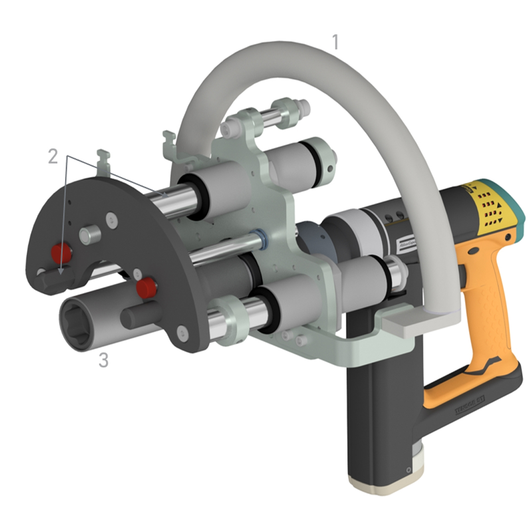 Tightening the central screw/nut on the front axle. The torque is to be absorbed via the locking pins of the adaptation from the axle.