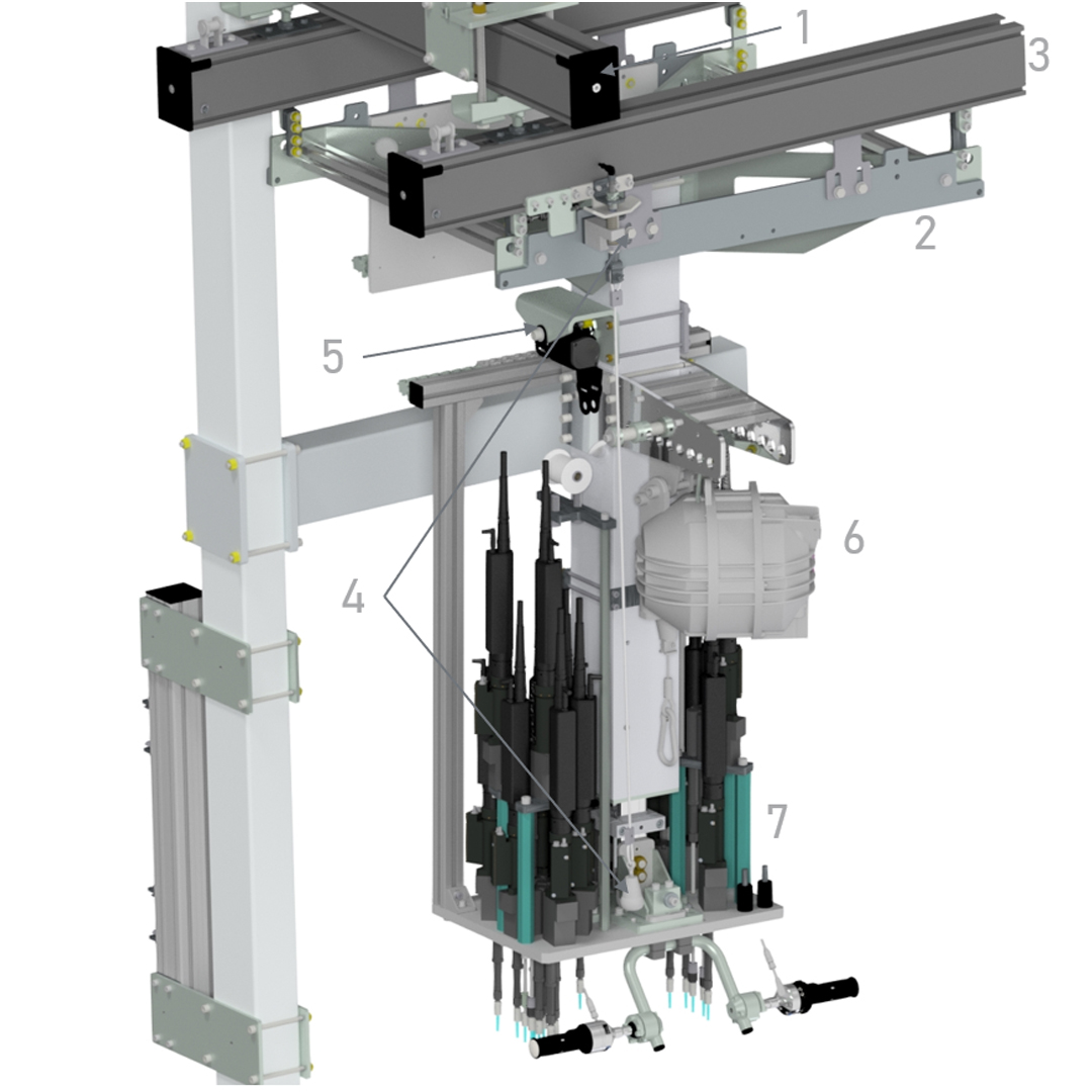 Screwing the control unit and bell to the gearbox. A total of 15 screw connections must be made on the control unit, for the rework of which a separate handling device must be used. In addition, the bell must be screwed to the gearbox. All work takes place in one station under cramped conditions.