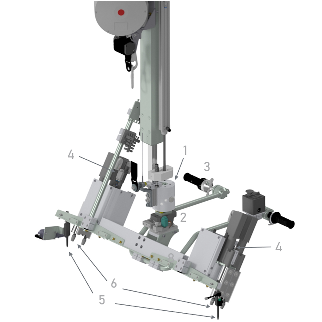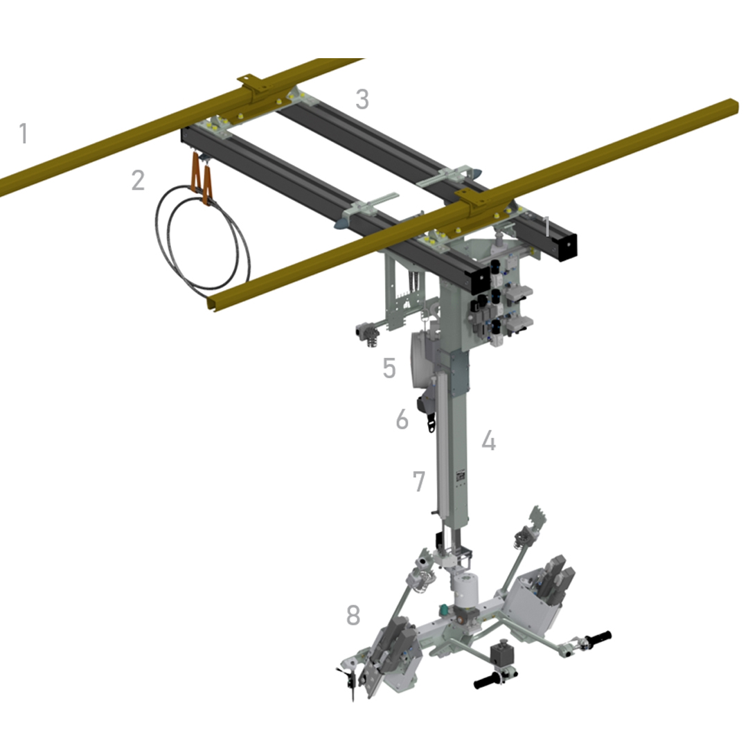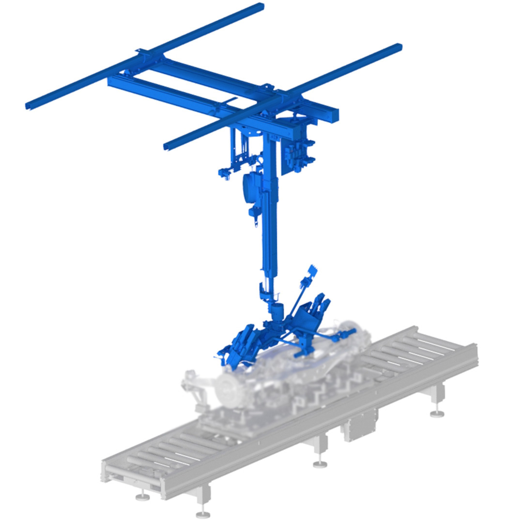 Verschrauben von Stabilisator am Hinterachsträger. Das System muss als Halbautomat ausgeführt werden. Die Zustellung in der Z-Achse erfolgt pneumatisch. Die Adaption muss auf dem Hinterachsträger abgesteckt sein. Die Verschraubung erfolgt mit zwei Spindeln pro Seite mit pneumatischem Vorschub. Nach der Verschraubung fährt das System zurück in die Parkstellung in der Z-Achse.