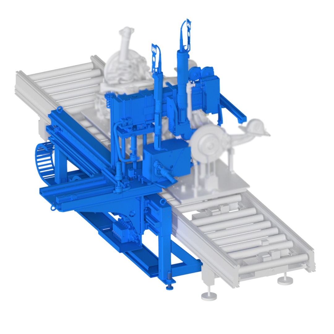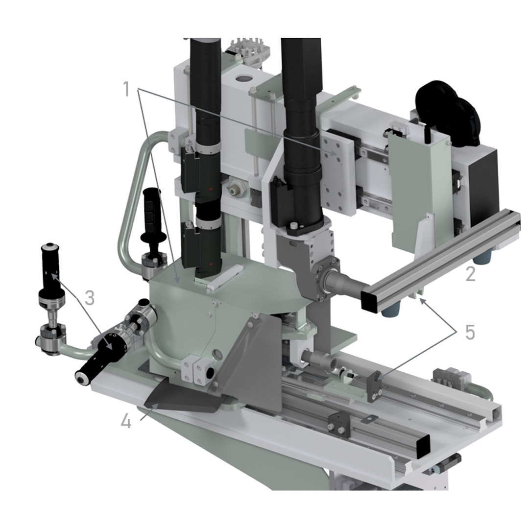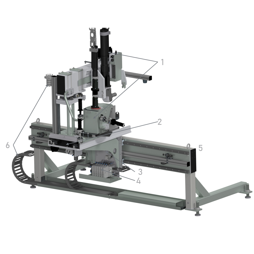 Die halbautomatische Einheit wird mechanisch in X-/Y-Richtung positioniert und verriegelt. Nach Betätigung des Starthebels, wird der Gegenhalter pneumatisch auf die Mutter positioniert, um im Anschluss pneumatisch die Spindel mit anzudrücken für das Verschrauben der beiden Schraubstellen.