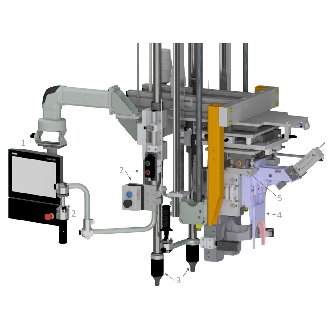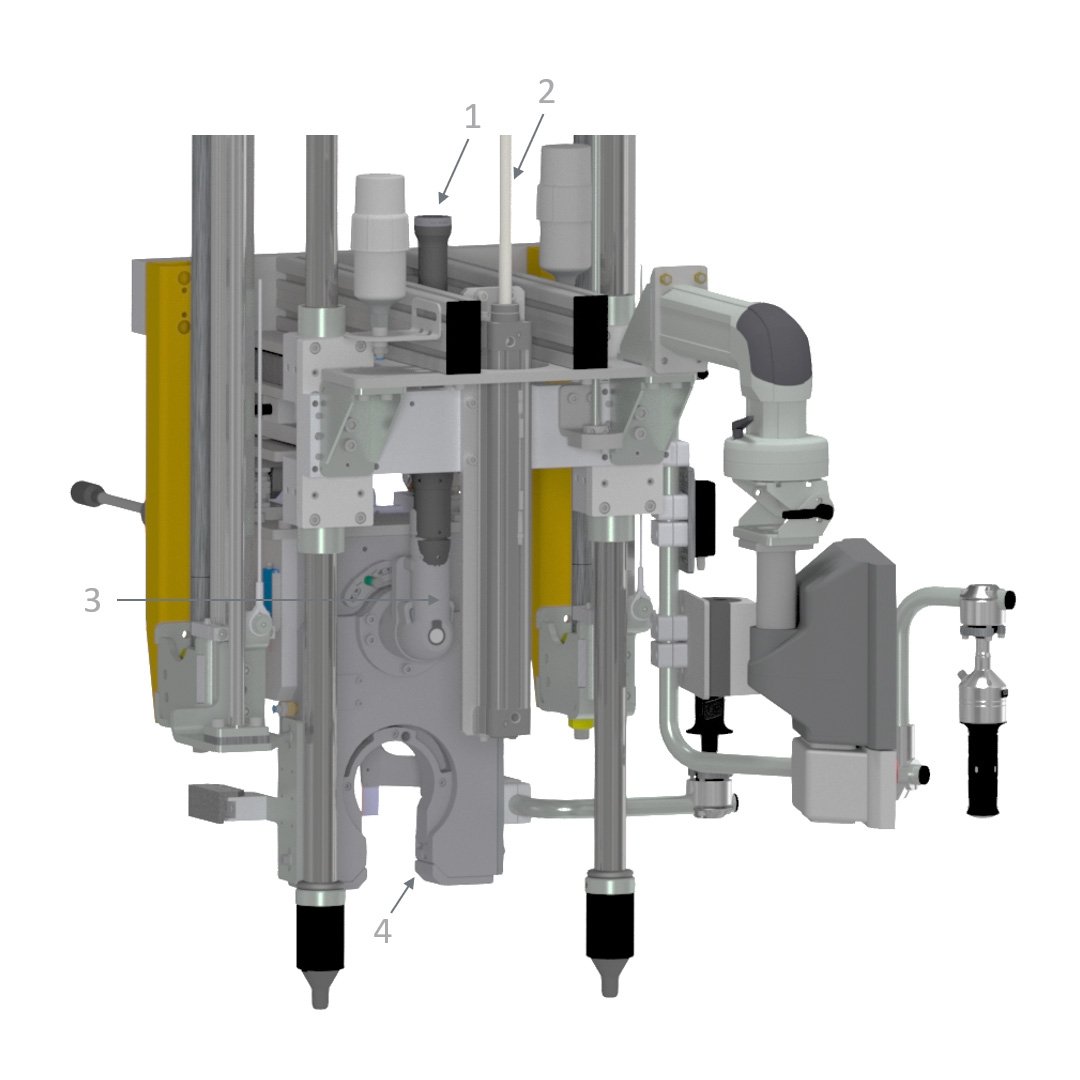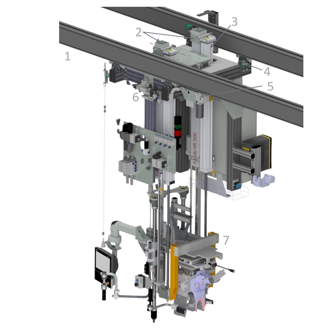 Für den Einsatz in der Fließmontage erfolgt zu Beginn die Synchronisierung des Handlingsgeräts über einen Reibradantrieb mit der Bandgeschwindigkeit. Zur exakten Fixierung wird das System anschließend über zwei Dorne am Werkstückträger (WT) abgesteckt. Daraufhin verfährt das Adaptionssystem pneumatisch in die definierte Schraubposition, um die Gelenkwelle mittels eines Offenmaulschlüssels prozesssicher am Hinterachsgetriebe zu verschrauben