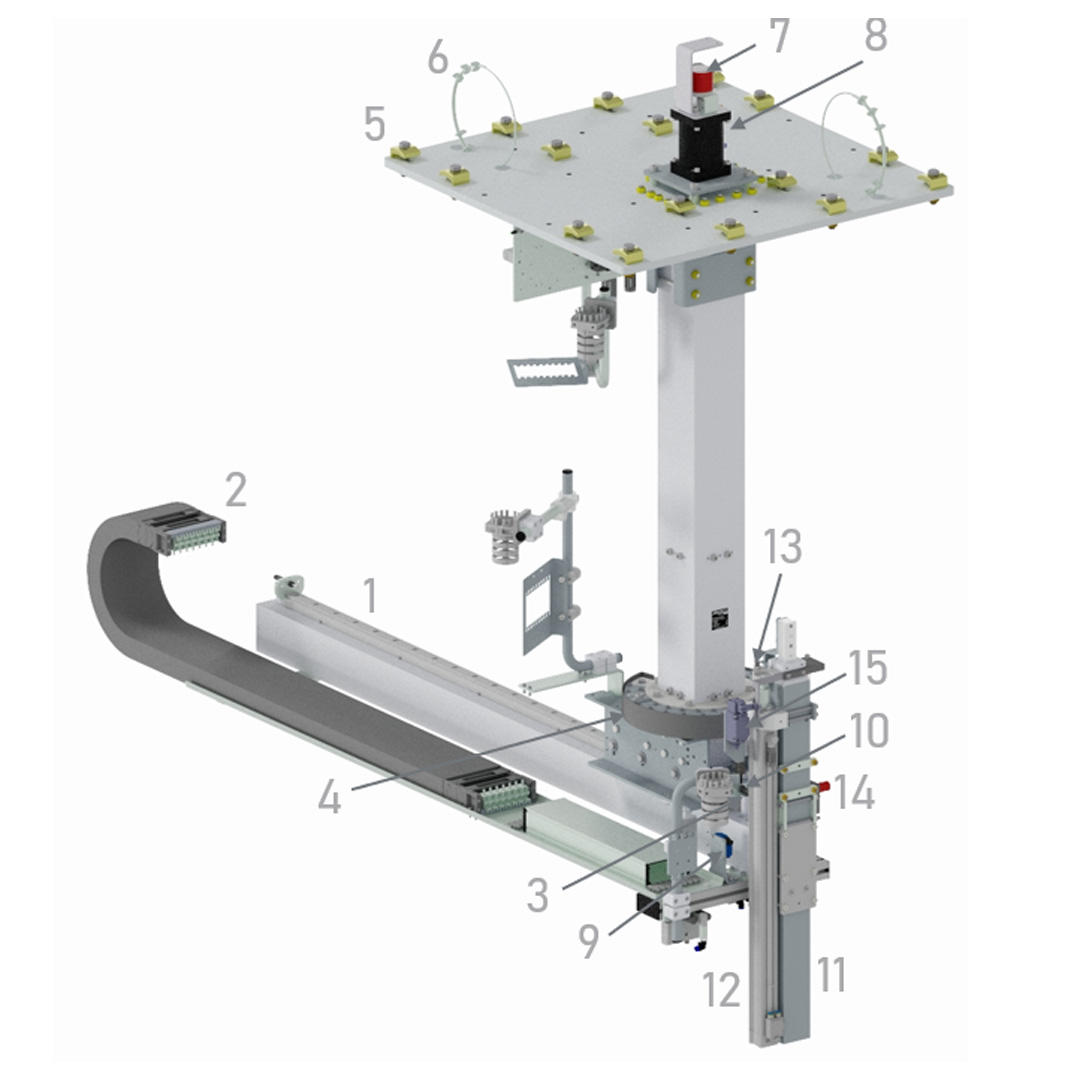 Verschrauben der Nacharbeit Hochzeit am Unterboden. Das Handlingsgerät ist an einer festen Stelle am Stahlbau zu montieren. Die Verschraubung erfolgt über den Mechrahmen. Der Vorschub erfolgt pneumatisch. Die Schraubrichtungen sind vertikal von unten sowie schräg unter verschiedenen Winkeln auszuführen.