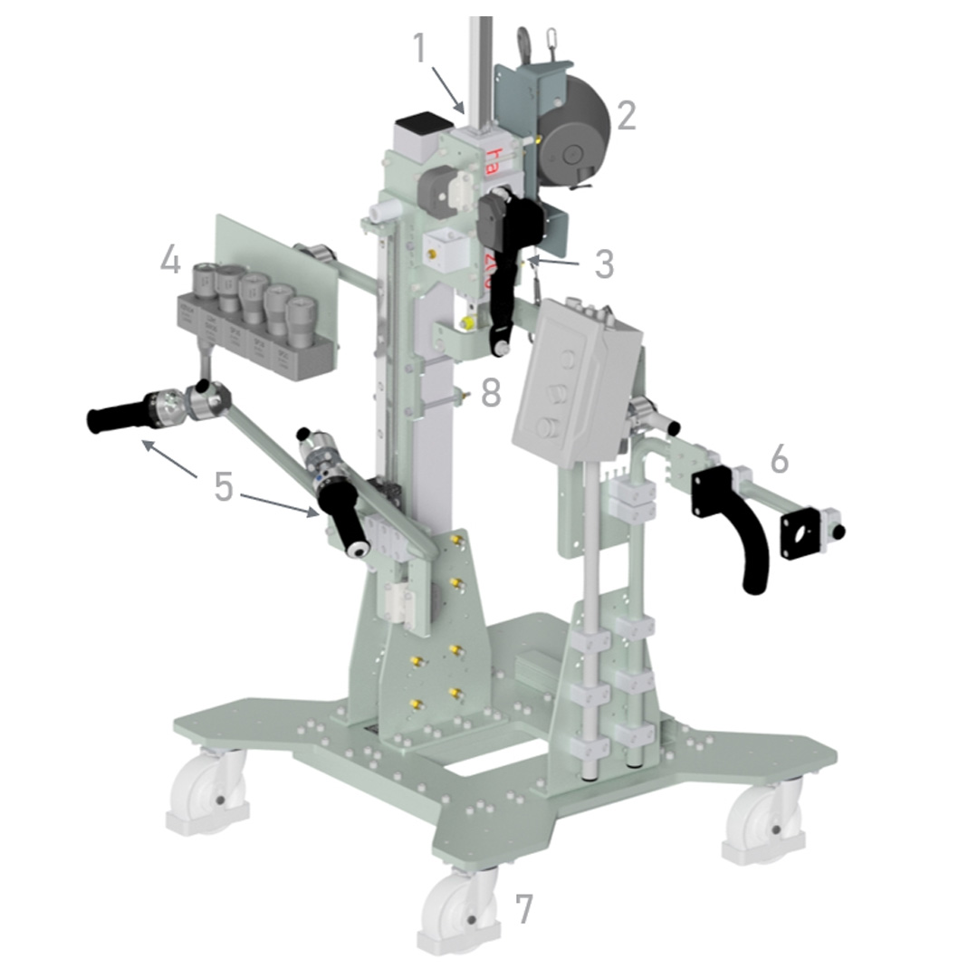 Verschrauben von Stehbolzen am Unterboden. Aufgrund des großen Arbeitsbereichs ist eine mobile Lösung erforderlich. Die Spindel ist durch Drücken von oben nach unten zuzustellen. Es sind viele unterschiedliche Schraubengrößen zu berücksichtigen